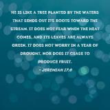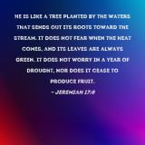 Pictures and Artwork He is like a tree planted by the waters that sends out its roots toward the stream. It does not fear when the heat comes, and its leaves are always green. It does not worry in a year of drought, nor does it cease to produce fruit. |