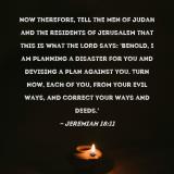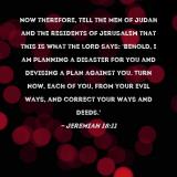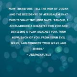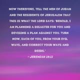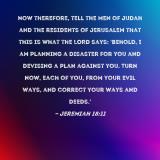 Pictures and Artwork Now therefore, tell the men of Judah and the residents of Jerusalem that this is what the LORD says: 'Behold, I am planning a disaster for you and devising a plan against you. Turn now, each of you, from your evil ways, and correct your ways and deeds.' |