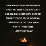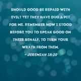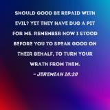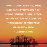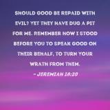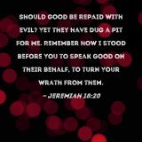 Should good be repaid with evil? Yet they have dug a pit for me. Remember how I stood before You to speak good on their behalf, to turn Your wrath from them.