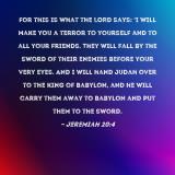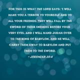 Pictures and Artwork For this is what the LORD says: 'I will make you a terror to yourself and to all your friends. They will fall by the sword of their enemies before your very eyes. And I will hand Judah over to the king of Babylon, and he will carry them away to Babylon and put them to the sword. |