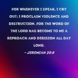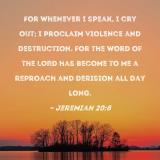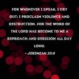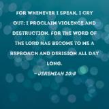 For whenever I speak, I cry out; I proclaim violence and destruction. For the word of the LORD has become to me a reproach and derision all day long.