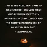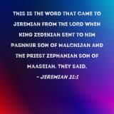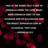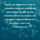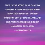 This is the word that came to Jeremiah from the LORD when King Zedekiah sent to him Pashhur son of Malchijah and the priest Zephaniah son of Maaseiah. They said,