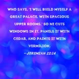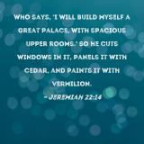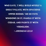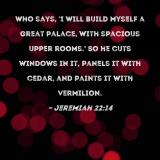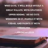 who says, 'I will build myself a great palace, with spacious upper rooms.' So he cuts windows in it, panels it with cedar, and paints it with vermilion.