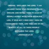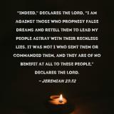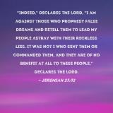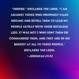 Pictures and Artwork "Indeed," declares the LORD, "I am against those who prophesy false dreams and retell them to lead My people astray with their reckless lies. It was not I who sent them or commanded them, and they are of no benefit at all to these people," declares the LORD. |