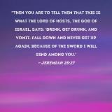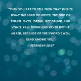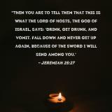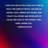 "Then you are to tell them that this is what the LORD of Hosts, the God of Israel, says: 'Drink, get drunk, and vomit. Fall down and never get up again, because of the sword I will send among you.'