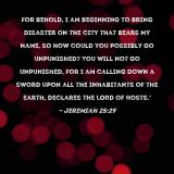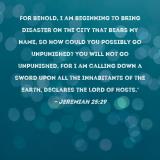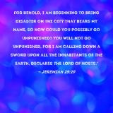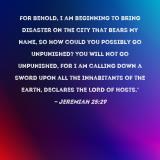 Pictures and Artwork For behold, I am beginning to bring disaster on the city that bears My Name, so how could you possibly go unpunished? You will not go unpunished, for I am calling down a sword upon all the inhabitants of the earth, declares the LORD of Hosts.' |