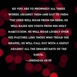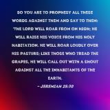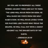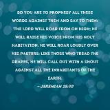 Pictures and Artwork So you are to prophesy all these words against them and say to them: 'The LORD will roar from on high; He will raise His voice from His holy habitation. He will roar loudly over His pasture; like those who tread the grapes, He will call out with a shout against all the inhabitants of the earth. |