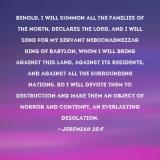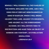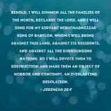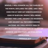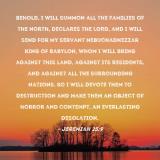 Pictures and Artwork behold, I will summon all the families of the north, declares the LORD, and I will send for My servant Nebuchadnezzar king of Babylon, whom I will bring against this land, against its residents, and against all the surrounding nations. So I will devote them to destruction and make them an object of horror and contempt, an everlasting desolation. |