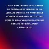 "This is what the LORD says: Stand in the courtyard of the house of the LORD and speak all the words I have commanded you to speak to all the cities of Judah who come to worship there. Do not omit a word.