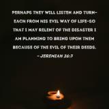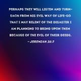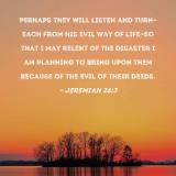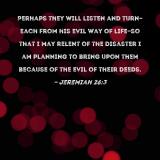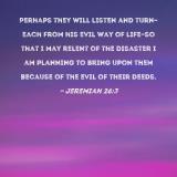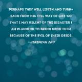 Perhaps they will listen and turn--each from his evil way of life--so that I may relent of the disaster I am planning to bring upon them because of the evil of their deeds.