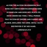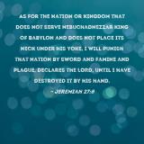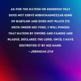 Pictures and Artwork As for the nation or kingdom that does not serve Nebuchadnezzar king of Babylon and does not place its neck under his yoke, I will punish that nation by sword and famine and plague, declares the LORD, until I have destroyed it by his hand. |