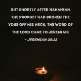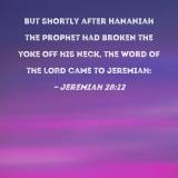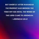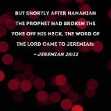 But shortly after Hananiah the prophet had broken the yoke off his neck, the word of the LORD came to Jeremiah: