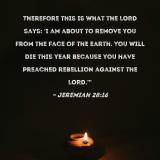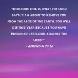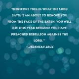 Therefore this is what the LORD says: 'I am about to remove you from the face of the earth. You will die this year because you have preached rebellion against the LORD.'"