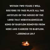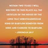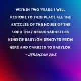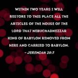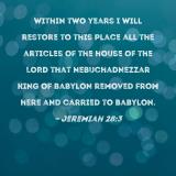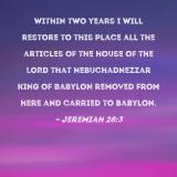 Within two years I will restore to this place all the articles of the house of the LORD that Nebuchadnezzar king of Babylon removed from here and carried to Babylon.