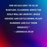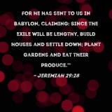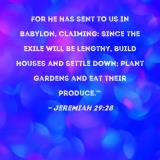 For he has sent to us in Babylon, claiming: Since the exile will be lengthy, build houses and settle down; plant gardens and eat their produce.'"