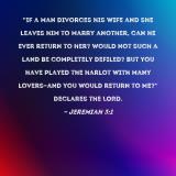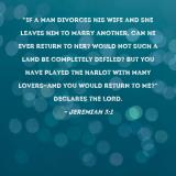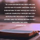 Pictures and Artwork "If a man divorces his wife and she leaves him to marry another, can he ever return to her? Would not such a land be completely defiled? But you have played the harlot with many lovers--and you would return to Me?" declares the LORD. |