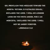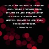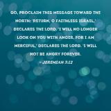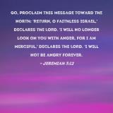 Go, proclaim this message toward the north: 'Return, O faithless Israel,' declares the LORD. 'I will no longer look on you with anger, for I am merciful,' declares the LORD. 'I will not be angry forever.