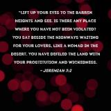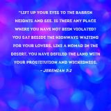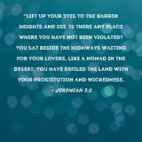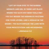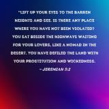 Pictures and Artwork "Lift up your eyes to the barren heights and see. Is there any place where you have not been violated? You sat beside the highways waiting for your lovers, like a nomad in the desert. You have defiled the land with your prostitution and wickedness. |