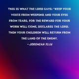 This is what the LORD says: "Keep your voice from weeping and your eyes from tears, for the reward for your work will come, declares the LORD. Then your children will return from the land of the enemy.