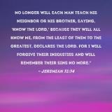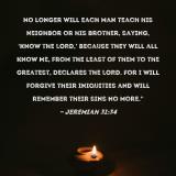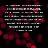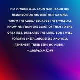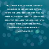 Pictures and Artwork No longer will each man teach his neighbor or his brother, saying, 'Know the LORD,' because they will all know Me, from the least of them to the greatest, declares the LORD. For I will forgive their iniquities and will remember their sins no more." |