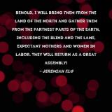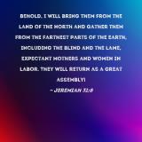 Behold, I will bring them from the land of the north and gather them from the farthest parts of the earth, including the blind and the lame, expectant mothers and women in labor. They will return as a great assembly!