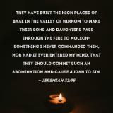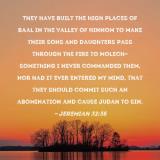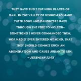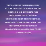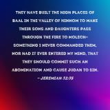 Pictures and Artwork They have built the high places of Baal in the Valley of Hinnom to make their sons and daughters pass through the fire to Molech--something I never commanded them, nor had it ever entered My mind, that they should commit such an abomination and cause Judah to sin. |