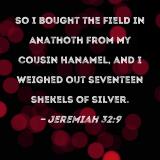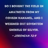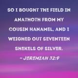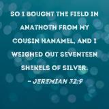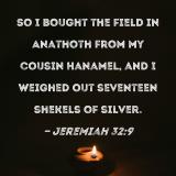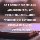 So I bought the field in Anathoth from my cousin Hanamel, and I weighed out seventeen shekels of silver.