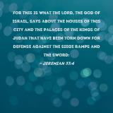 For this is what the LORD, the God of Israel, says about the houses of this city and the palaces of the kings of Judah that have been torn down for defense against the siege ramps and the sword: