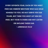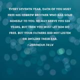 Every seventh year, each of you must free his Hebrew brother who has sold himself to you. He may serve you six years, but then you must let him go free. But your fathers did not listen or incline their ear.