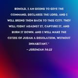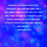 Behold, I am going to give the command, declares the LORD, and I will bring them back to this city. They will fight against it, capture it, and burn it down. And I will make the cities of Judah a desolation, without inhabitant."