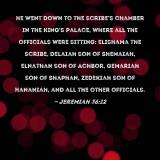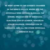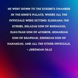 Pictures and Artwork he went down to the scribe's chamber in the king's palace, where all the officials were sitting: Elishama the scribe, Delaiah son of Shemaiah, Elnathan son of Achbor, Gemariah son of Shaphan, Zedekiah son of Hananiah, and all the other officials. |