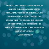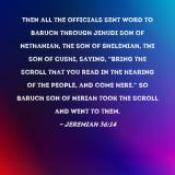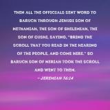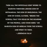 Pictures and Artwork Then all the officials sent word to Baruch through Jehudi son of Nethaniah, the son of Shelemiah, the son of Cushi, saying, "Bring the scroll that you read in the hearing of the people, and come here." So Baruch son of Neriah took the scroll and went to them. |