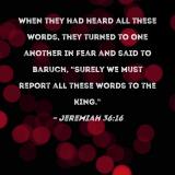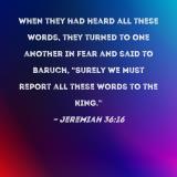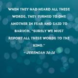 When they had heard all these words, they turned to one another in fear and said to Baruch, "Surely we must report all these words to the king."