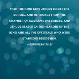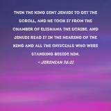 Then the king sent Jehudi to get the scroll, and he took it from the chamber of Elishama the scribe. And Jehudi read it in the hearing of the king and all the officials who were standing beside him.