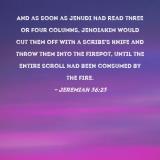 And as soon as Jehudi had read three or four columns, Jehoiakim would cut them off with a scribe's knife and throw them into the firepot, until the entire scroll had been consumed by the fire.
