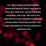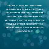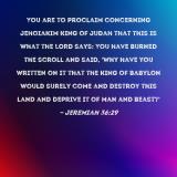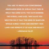Pictures and Artwork You are to proclaim concerning Jehoiakim king of Judah that this is what the LORD says: You have burned the scroll and said, 'Why have you written on it that the king of Babylon would surely come and destroy this land and deprive it of man and beast?' |