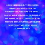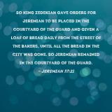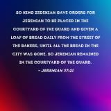 Pictures and Artwork So King Zedekiah gave orders for Jeremiah to be placed in the courtyard of the guard and given a loaf of bread daily from the street of the bakers, until all the bread in the city was gone. So Jeremiah remained in the courtyard of the guard. |