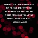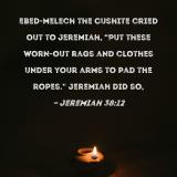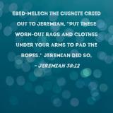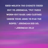 Ebed-melech the Cushite cried out to Jeremiah, "Put these worn-out rags and clothes under your arms to pad the ropes." Jeremiah did so,