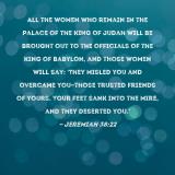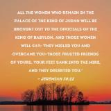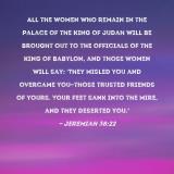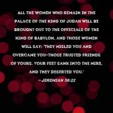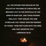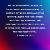 Pictures and Artwork All the women who remain in the palace of the king of Judah will be brought out to the officials of the king of Babylon, and those women will say: 'They misled you and overcame you--those trusted friends of yours. Your feet sank into the mire, and they deserted you.' |