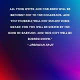 All your wives and children will be brought out to the Chaldeans. And you yourself will not escape their grasp, for you will be seized by the king of Babylon, and this city will be burned down."