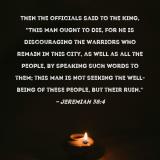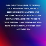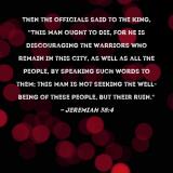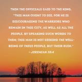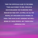Pictures and Artwork Then the officials said to the king, "This man ought to die, for he is discouraging the warriors who remain in this city, as well as all the people, by speaking such words to them; this man is not seeking the well-being of these people, but their ruin." |