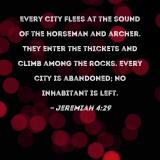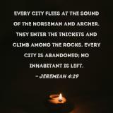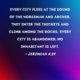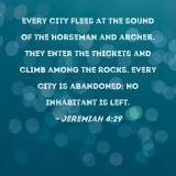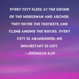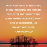 Every city flees at the sound of the horseman and archer. They enter the thickets and climb among the rocks. Every city is abandoned; no inhabitant is left.