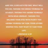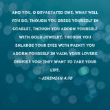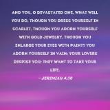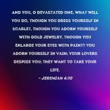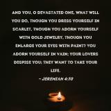 Pictures and Artwork And you, O devastated one, what will you do, though you dress yourself in scarlet, though you adorn yourself with gold jewelry, though you enlarge your eyes with paint? You adorn yourself in vain; your lovers despise you; they want to take your life. |