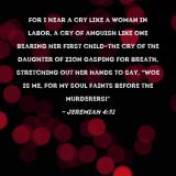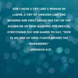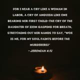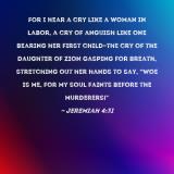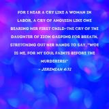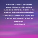 For I hear a cry like a woman in labor, a cry of anguish like one bearing her first child--the cry of the Daughter of Zion gasping for breath, stretching out her hands to say, "Woe is me, for my soul faints before the murderers!"