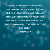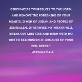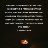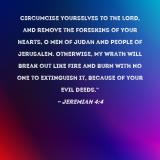 Circumcise yourselves to the LORD, and remove the foreskins of your hearts, O men of Judah and people of Jerusalem. Otherwise, My wrath will break out like fire and burn with no one to extinguish it, because of your evil deeds."