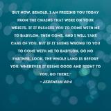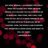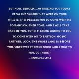 Pictures and Artwork But now, behold, I am freeing you today from the chains that were on your wrists. If it pleases you to come with me to Babylon, then come, and I will take care of you. But if it seems wrong to you to come with me to Babylon, go no farther. Look, the whole land is before you. Wherever it seems good and right to you, go there." |