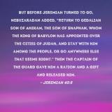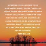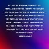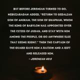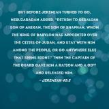 Pictures and Artwork But before Jeremiah turned to go, Nebuzaradan added, "Return to Gedaliah son of Ahikam, the son of Shaphan, whom the king of Babylon has appointed over the cities of Judah, and stay with him among the people, or go anywhere else that seems right." Then the captain of the guard gave him a ration and a gift and released him. |