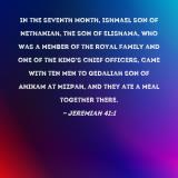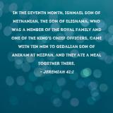 Pictures and Artwork In the seventh month, Ishmael son of Nethaniah, the son of Elishama, who was a member of the royal family and one of the king's chief officers, came with ten men to Gedaliah son of Ahikam at Mizpah, and they ate a meal together there. |
