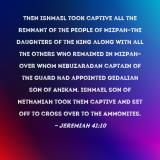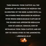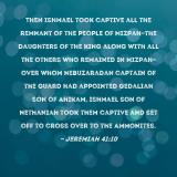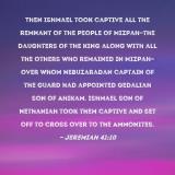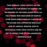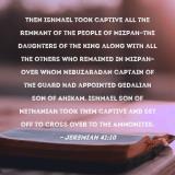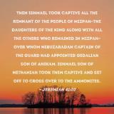 Pictures and Artwork Then Ishmael took captive all the remnant of the people of Mizpah--the daughters of the king along with all the others who remained in Mizpah--over whom Nebuzaradan captain of the guard had appointed Gedaliah son of Ahikam. Ishmael son of Nethaniah took them captive and set off to cross over to the Ammonites. |