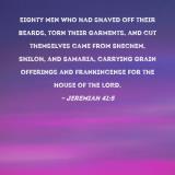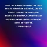 eighty men who had shaved off their beards, torn their garments, and cut themselves came from Shechem, Shiloh, and Samaria, carrying grain offerings and frankincense for the house of the LORD.